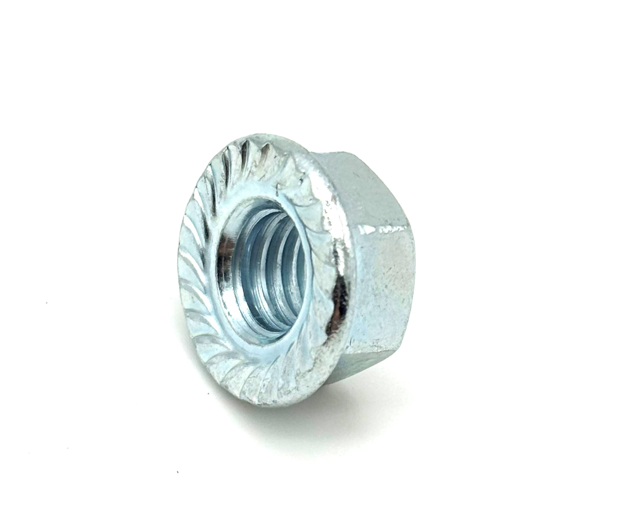 A flanged serrated nut is a specialized fastener featuring a built-in flange with serrated, or toothed, edges designed to grip the surface more securely. The serrations prevent the nut from loosening due to vibrations and dynamic forces, making it ideal for high-vibration environments. Commonly used in automotive, aerospace, and industrial applications, these nuts provide reliable, stable fastening for critical components, ensuring that assemblies remain secure under challenging conditions.